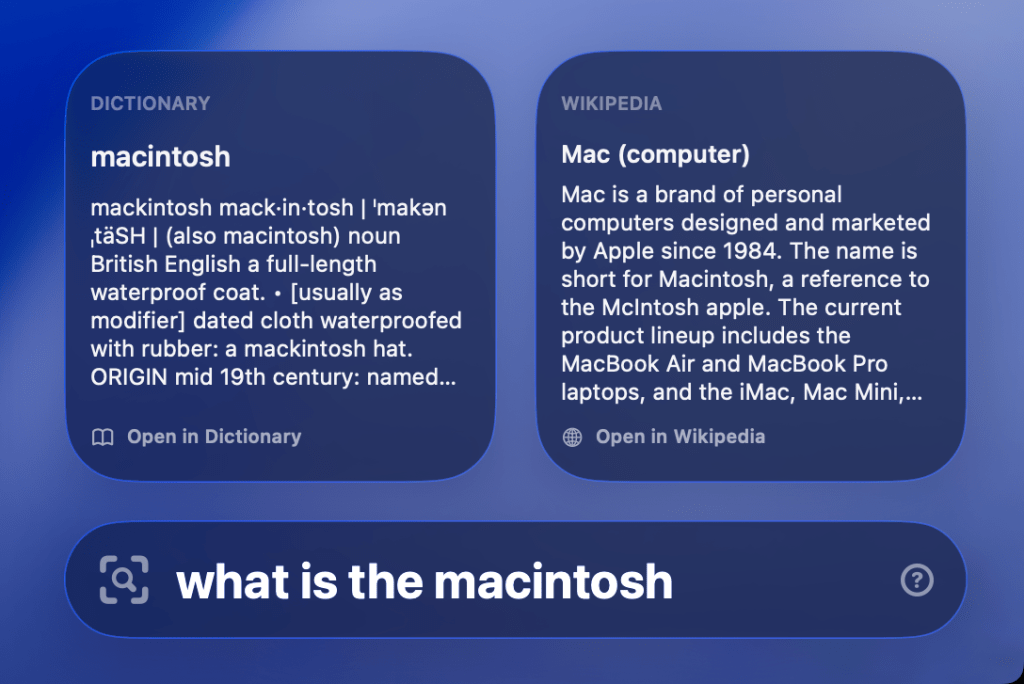 Ele também oferece recursos de calculadora e conversão de moeda – tudo em uma pequena barra de pesquisa no canto inferior direito do seu Mac (embora você tenha a opção de movê-la, se desejar).
