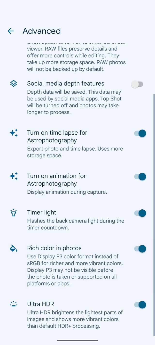 A alternativa está escondida sob o Configurações da câmera > Avançado seleção de alimentos. O método aqui é compreender quando você vê o benefício. Quando isso é permitido, seu Pixel salva imagens na área de sombra P3 maior.