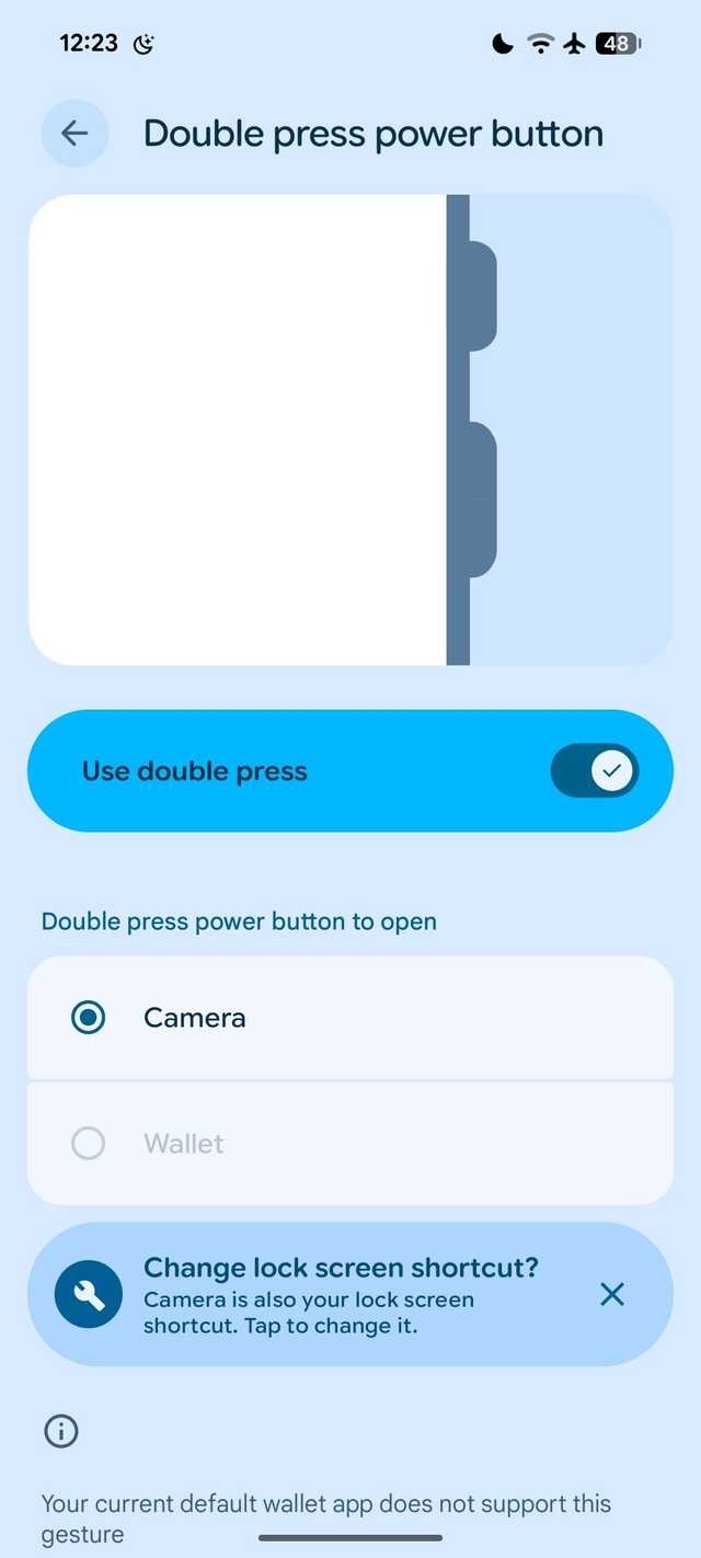 Eu fui para Configurações> Sistema> Movimentos> Pressione duas vezes o botão liga / desliga e permitiu a alternativa para câmera de vídeo.