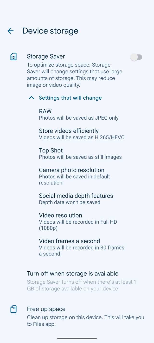 Fiquei preocupado com a falta de espaço porque estava tirando muitas imagens e vídeos em alta resolução. O atributo Economia de espaço de armazenamento é o excelente meio-termo.
