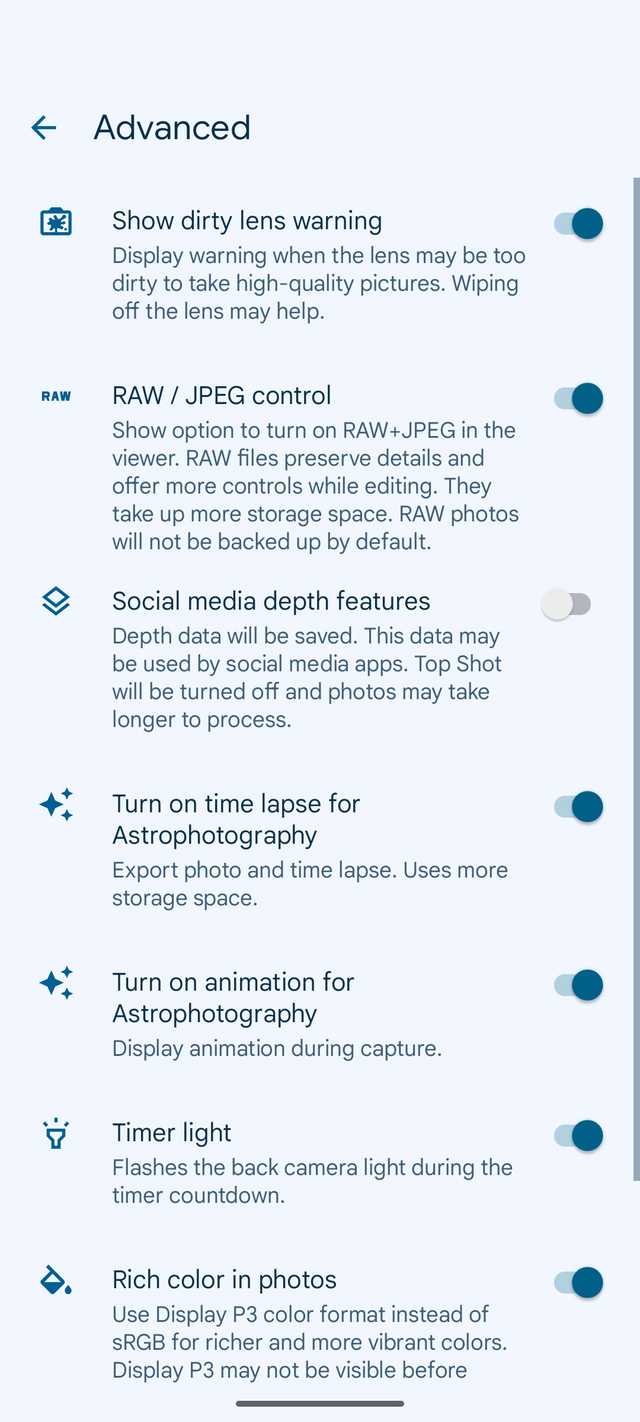 A alternativa está escondida sob o Configurações da câmera > Avançado seleção de alimentos. O método aqui é compreender quando você vê o benefício. Quando isso é permitido, seu Pixel salva imagens na área de sombra P3 maior.