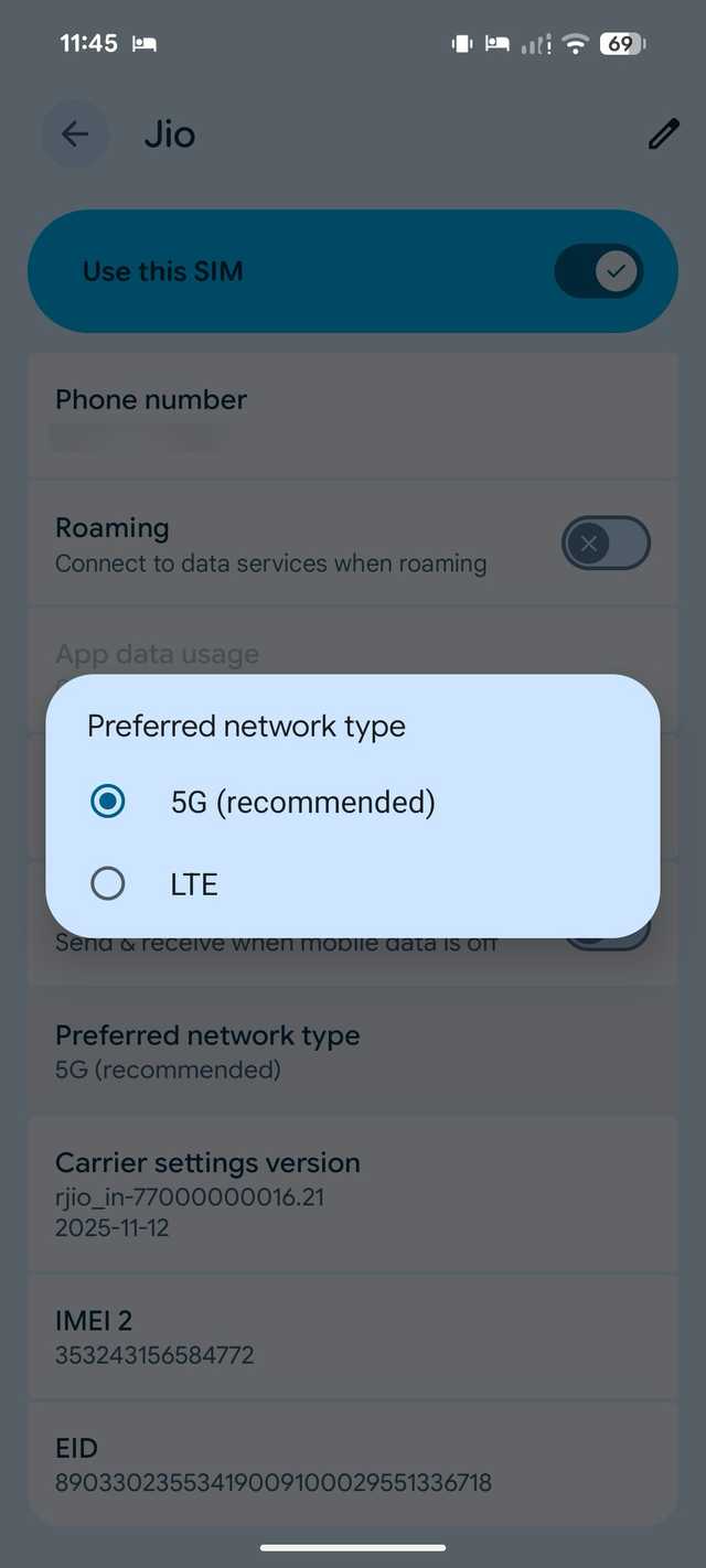 Você pode ir para Configurações > Rede e Internet > SIMs > Tipo de rede preferido e selecione LTE no menu a seguir.