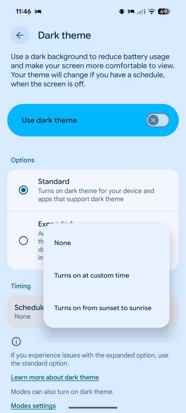 Parei de alterná-lo manualmente e coloquei-o em uma programação automática estrita. Configurei meu Pixel para mudar automaticamente para o modo escuro às 19h e voltar às 7h.