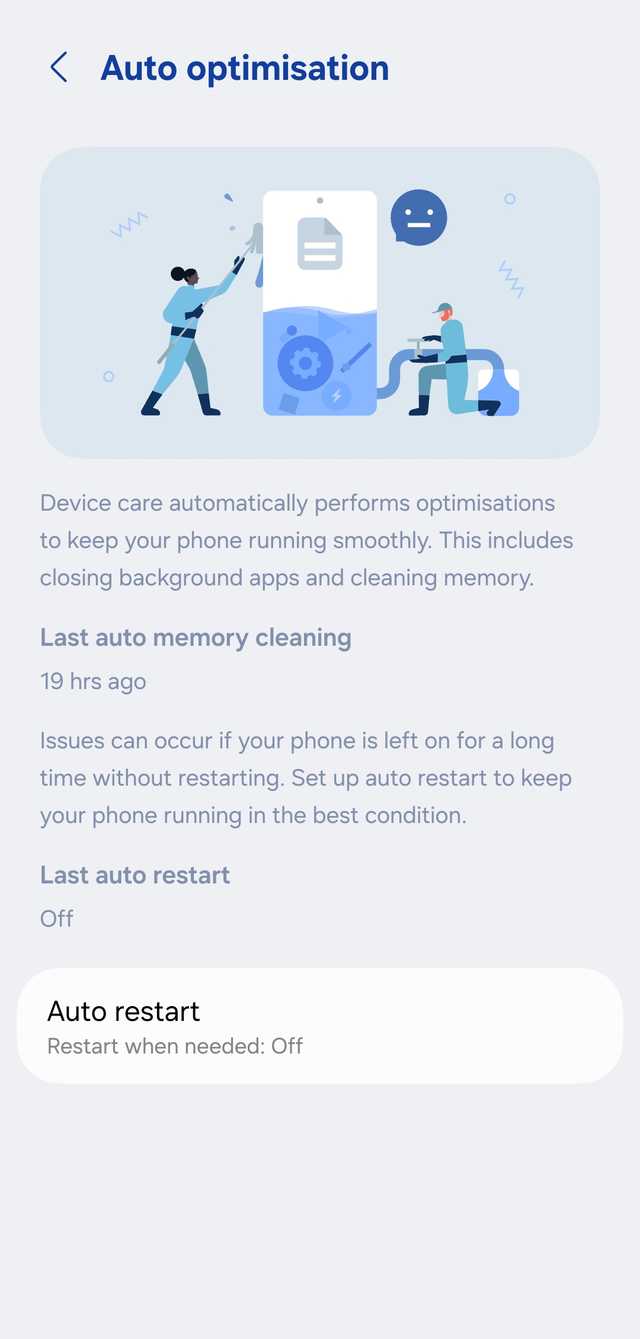 Em vez de esperar que meu telefone fique lento, deixo meu Galaxy cuidar de si mesmo enquanto durmo. Eu fui para Configurações > Cuidados com o dispositivo > Otimização automática e ligado Reinicialização automática.