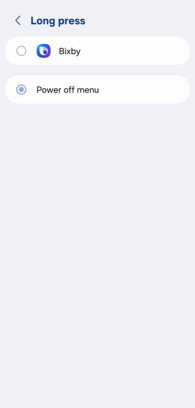 Fui direto para Configurações > Recursos avançados > Botão lateral. No Pressione e segure seção, a Samsung oferece duas opções: Acorde Bixby ou Menu desligar. Não consigo tocar nessa segunda opção com rapidez suficiente.