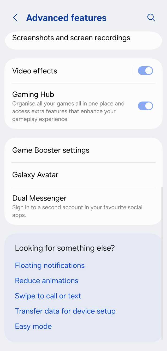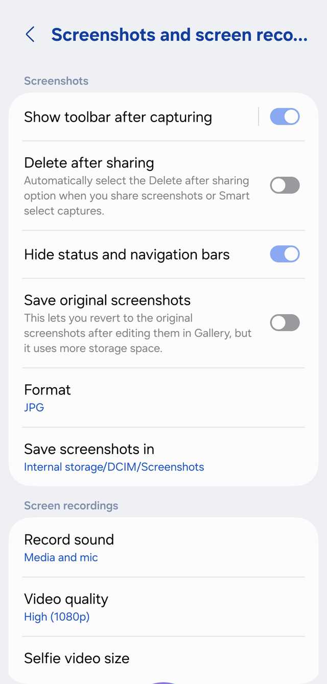 A Samsung também tem uma solução para isso. Eu fui para Configurações > Recursos avançados > Capturas de tela e gravações de tela e alternou a opção para ocultar barras de status e navegação.