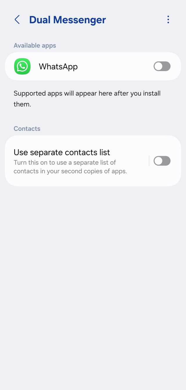 Em vez de carregar dois telefones ou alternar constantemente entre as versões Business e Personal do aplicativo, entrei em Configurações > Recursos avançados > Dual Messenger.