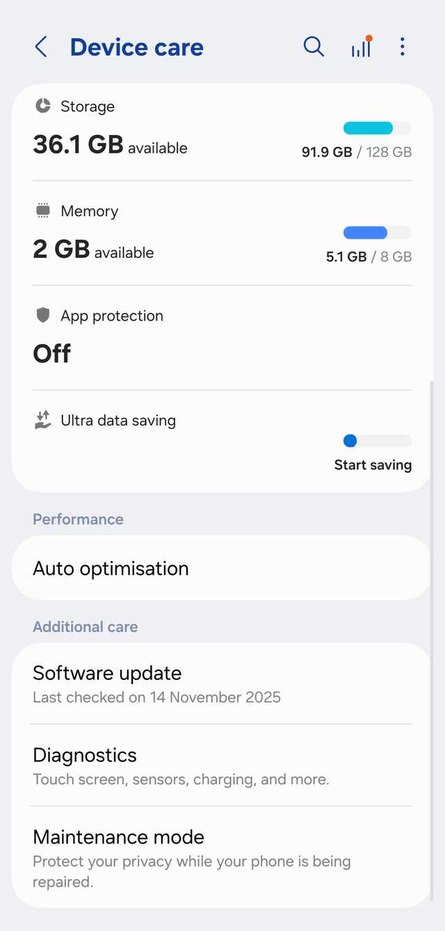 Em vez de esperar que meu telefone fique lento, deixo meu Galaxy cuidar de si mesmo enquanto durmo. Eu fui para Configurações > Cuidados com o dispositivo > Otimização automática e ligado Reinicialização automática.