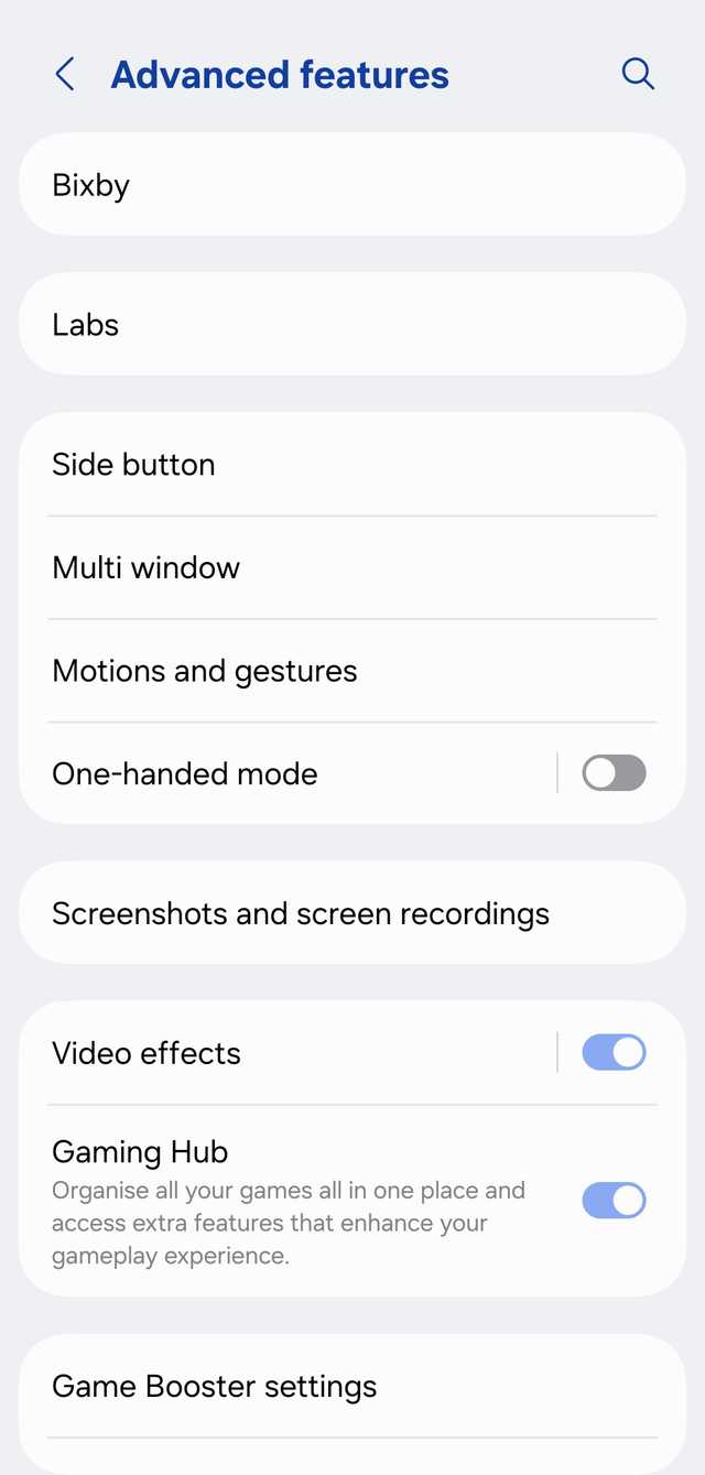 Fui direto para Configurações > Recursos avançados > Botão lateral. No Pressione e segure seção, a Samsung oferece duas opções: Acorde Bixby ou Menu desligar. Não consigo tocar nessa segunda opção com rapidez suficiente.