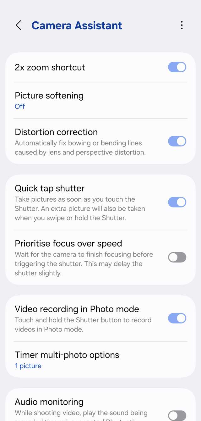 Não sou fã de como o processamento da Samsung lida com a pele e texturas finas. Então encontrei o botão Suavização de imagem dentro do módulo Camera Assistant e foi como se alguém finalmente tivesse limpado a graxa da minha lente.