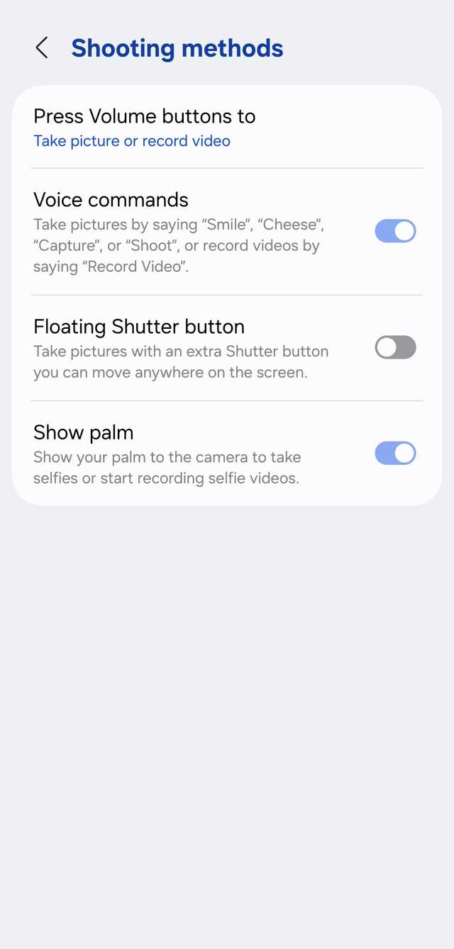 Eu habilitei a opção do Configurações da câmera > Métodos de fotografia menu. Agora, posso dizer Capturar ou Atirare mantenha as duas mãos travadas no telefone como um tripé.