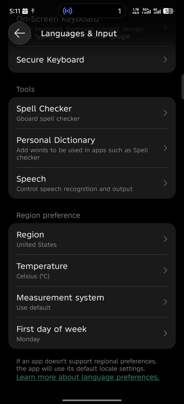 Antes, a escolha da região predefinida era os Estados Unidos. Conseqüentemente, meu telefone foi configurado para o sistema de unidades imperiais. Eu mudei para Inglês (Reino Unido) para obter a maior aproximação ao padrão do meu país.
