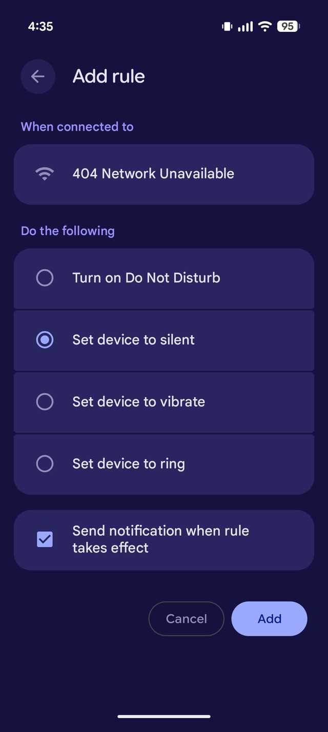Por exemplo, estabelecei meu telefone para alternar para a configuração de chamadas quando ele se conectar ao meu Wi-Fi doméstico e mudar para uma configuração silenciosa quando chegar ao local de trabalho.
