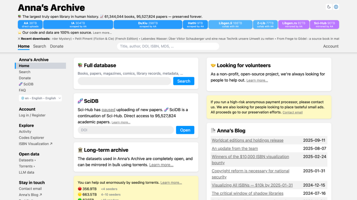 Pessoalmente, eu não tinha ouvido falar do Arquivo de Anna, o que faz sentido – é um player mais recente na área. A plataforma surgiu em 2022, logo após sua antecessora, Z-Library, ter seus domínios apreendidos pelo Departamento de Justiça dos EUA. Desde então, ele tem operado silenciosamente em seu cantinho da Internet, servindo como um mecanismo de busca de código aberto para obras literárias com links para fontes gratuitas disponíveis ao público, quando existem, e uploads piratas, quando não existem. Assim como a Z-Library, ela foi bloqueada por ISPs alemães e processada nos EUA, mas continua operacional.