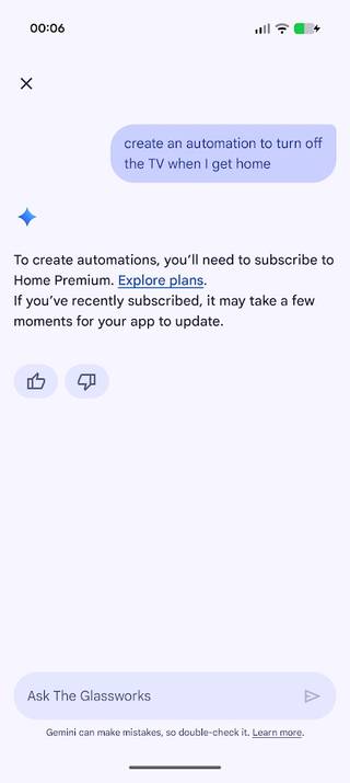Um pedido simples, prontamente rejeitado, informando-me que eu precisaria assinar o Home Premium para criar automações com o Gemini. Justo.