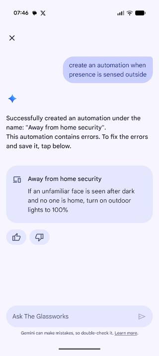 Ele não apenas criou uma automação com “sucesso” (contendo erros, é claro), mas parte da automação aparentemente acenderia minhas luzes externas em 100%. Moro em um apartamento sem luz externa.