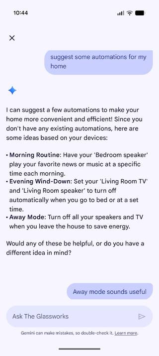 É a mesma experiência Gemini que tenho no meu Pixel; outros bônus são Gemini Live sem meu telefone, automações inteligentes e recursos aprimorados para câmeras e campainhas inteligentes.