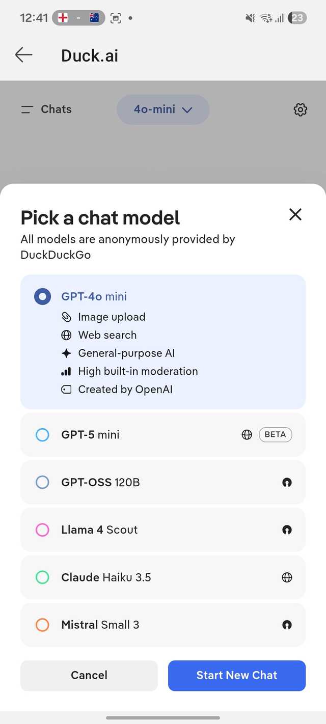 Posso ir para a seção Duck.ai para ver uma lista dos principais jogadores como GPT-5, Llama 4, Mistral, Claude e muito mais. Posso clicar naquele que considero melhor para minha tarefa específica.