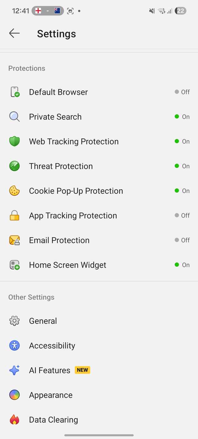 DuckDuckGo vem com recursos de privacidade. A melhor parte é que todos eles estão habilitados por padrão. Não precisei vasculhar menus complexos ou alternar trinta interruptores diferentes para ativar minha proteção.