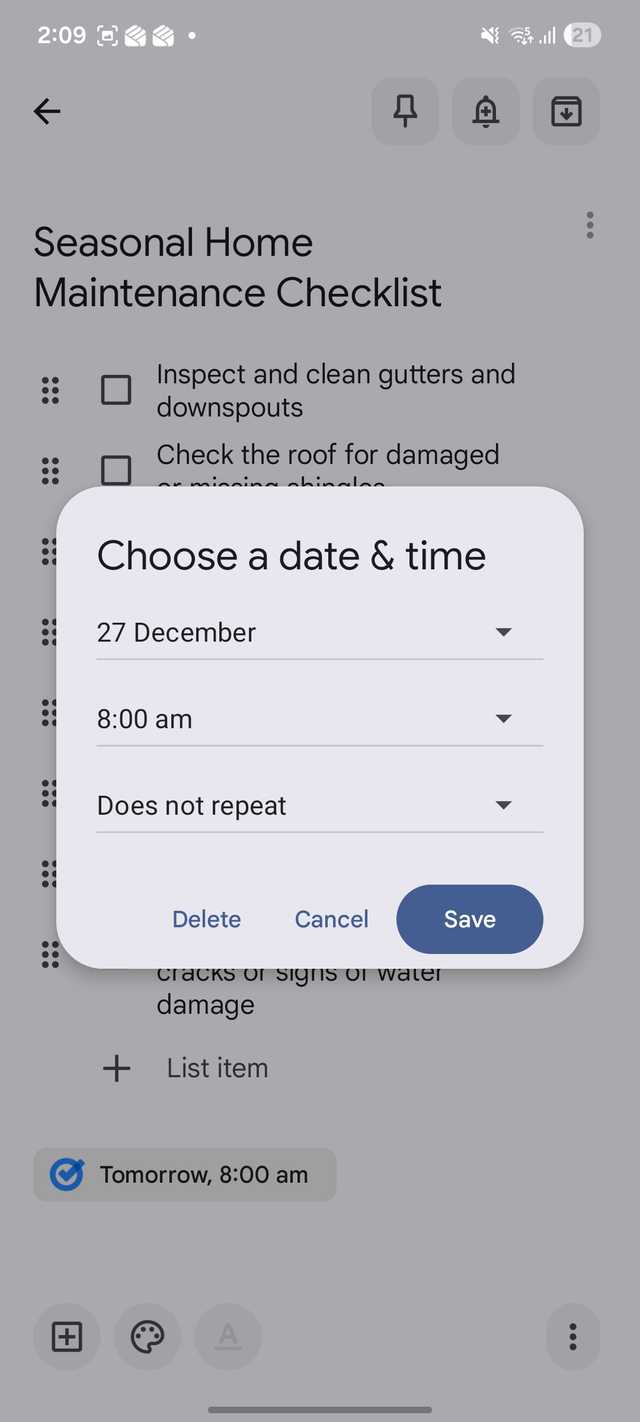 Depois de criar sua nota, certifique-se de tocar no ícone de lembrete na parte superior e abre o mesmo menu do Google Tasks. Você pode escolher uma data e hora. A qualquer momento, você pode tocar no ícone de lembrete e definir a frequência também.