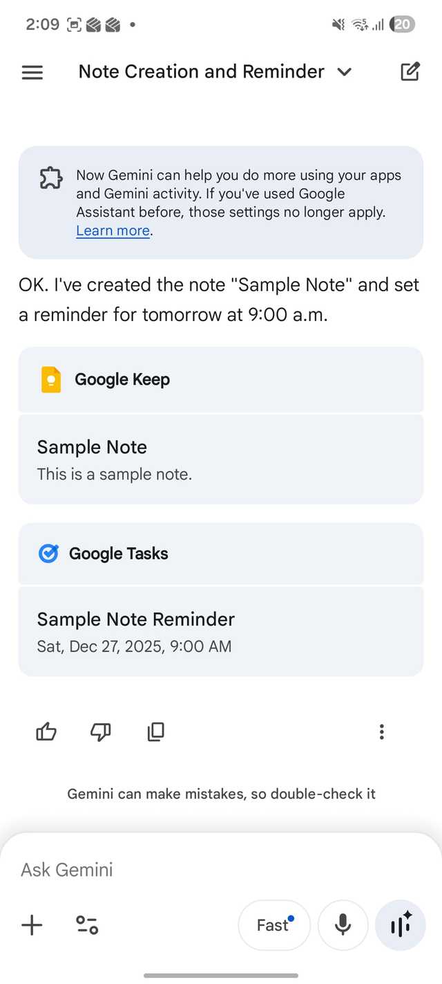 Gemini funciona perfeitamente com aplicativos do Google Workspace, incluindo Keep e Tasks. Posso simplesmente iniciar o Gemini e pedir-lhe para criar uma nova tarefa com um lembrete específico.