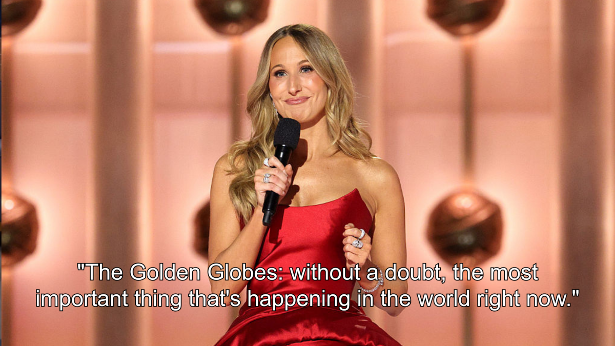A apresentadora do Globo de Ouro, Nikki Glaser, iniciou a cerimônia de premiação com um monólogo autoconsciente esta noite, acenando com a cabeça para os eventos de notícias atuais que estão distraindo quase todo mundo.