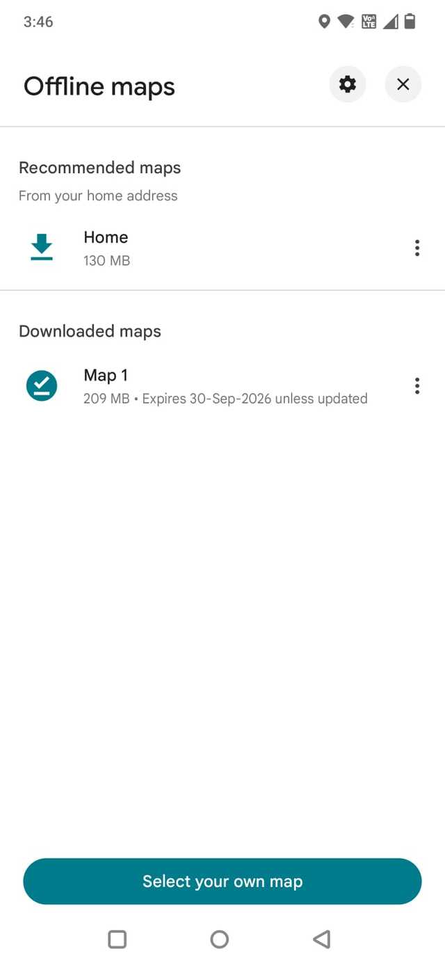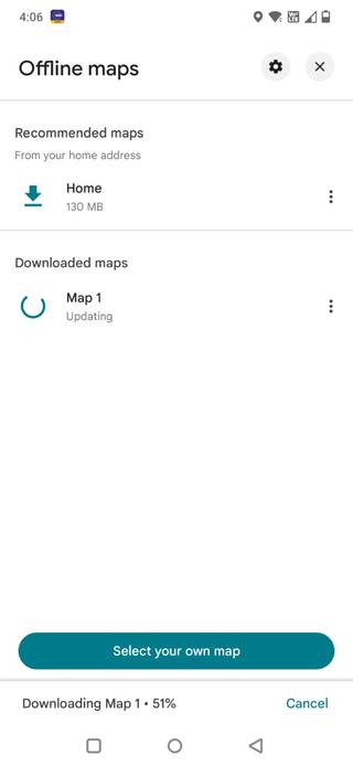 O procedimento é simples. Abro o Google Maps, toco no meu foto do perfiltorneira Mapas off-line > Selecione seu próprio mapae arraste para cobrir o local para onde me preparo para ir.