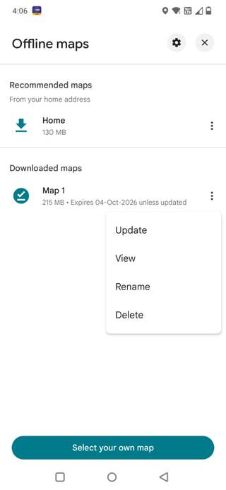 Na noite anterior à minha partida, abro o Google Maps, vou para o meu foto do perfile toque Mapas off-line. Sob Mapas baixadoseu toco o ícone de seleção de comida de três pontos e escolha Atualizar.