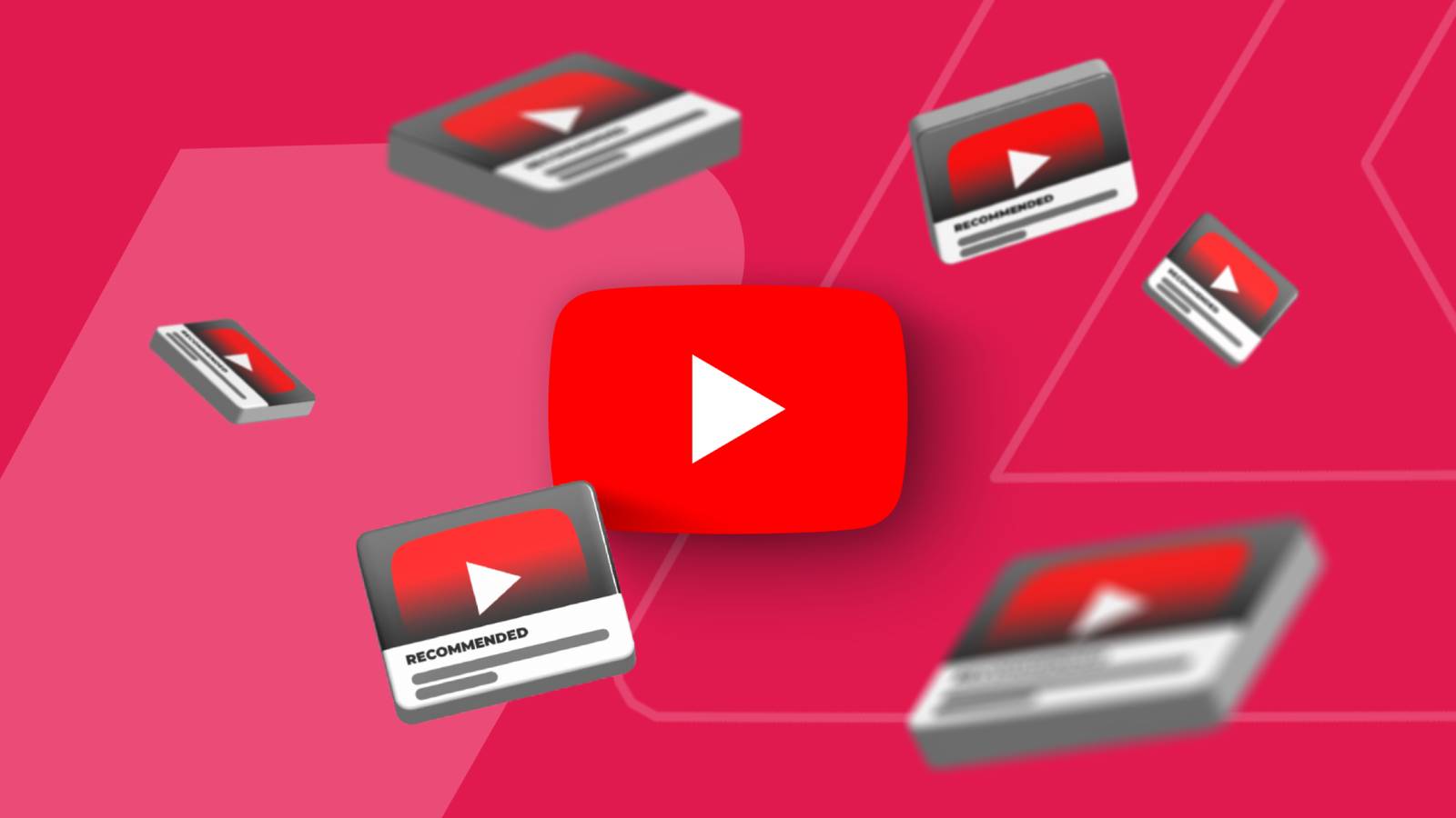 Vários logotipos 3D do YouTube flutuando sobre um fundo rosa e vermelho