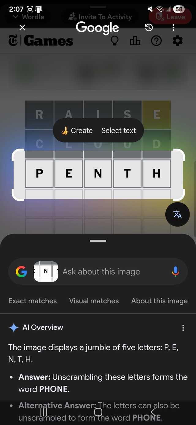 Eu tentei isso no aplicativo Wordle. Às vezes não sei se a palavra que estou prestes a adivinhar é comum, então uso Círculo para Pesquisar para procurá-la.