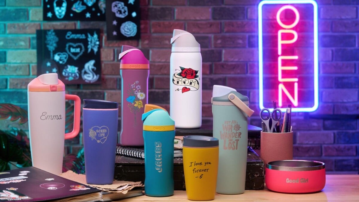 Owala está nos dando liberdade criativa para adicionar algo permanente às nossas garrafas de água. O salão Owala Tattoos permite gravar, imprimir ou adicionar uma manga completa à linha de produtos Owala.
