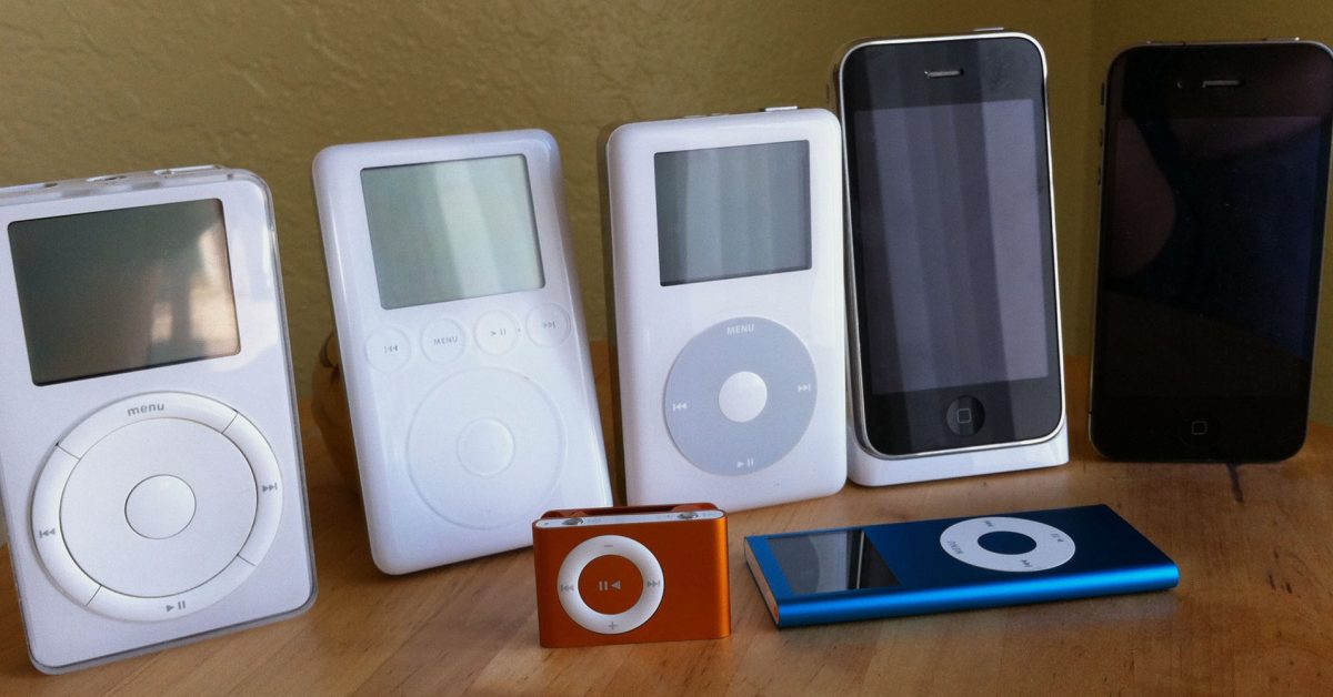 Relembrando o iPod original em seu 24º aniversário | Uma linha de modelos de iPod com o original à esquerda