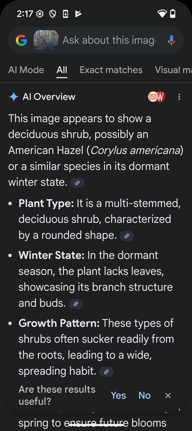 Quando havia muitas plantas agrupadas, o Google Lens nem sempre sabia em que focar na busca de imagens. Se puder, enquadre uma única árvore ou arbusto de cada vez.