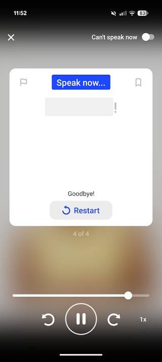 Eu pronunciei frases incorretamente deliberadamente, adicionei sílabas extras ou até inverti a ordem das palavras. Mas, desde que o que eu dissesse tivesse uma vaga semelhança com o alvo, o aplicativo o marcaria como correto.