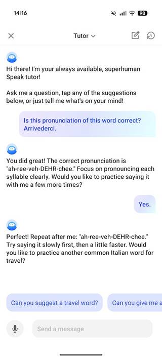 O chatbot é um pouco interativo demais para o meu gosto, mas é uma ótima maneira de praticar sua habilidade de falar. Ainda é muito indulgente, mas no geral é um método de aprendizagem eficaz.