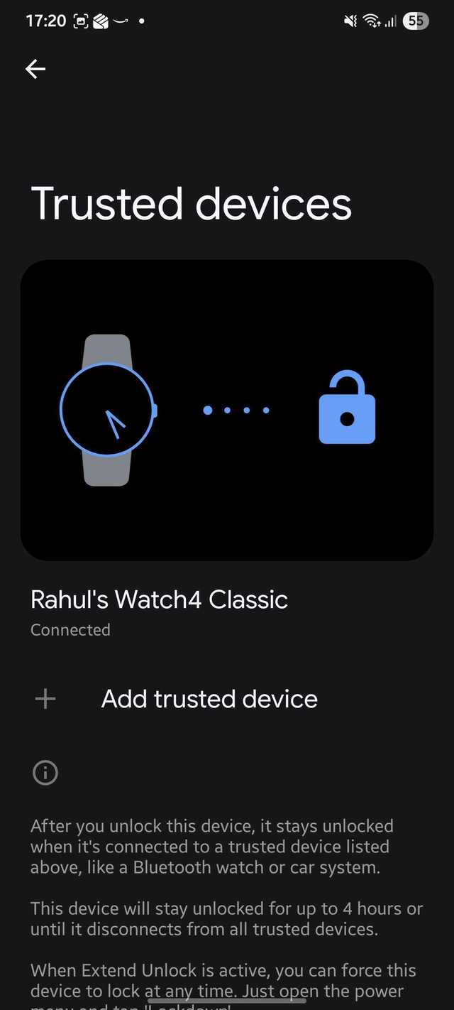 Também adicionei meu Galaxy Watch 4 Classic como um dispositivo confiável. Portanto, quando meu Galaxy S21 está conectado ou próximo a ele, não preciso me autenticar para desbloquear meu telefone.