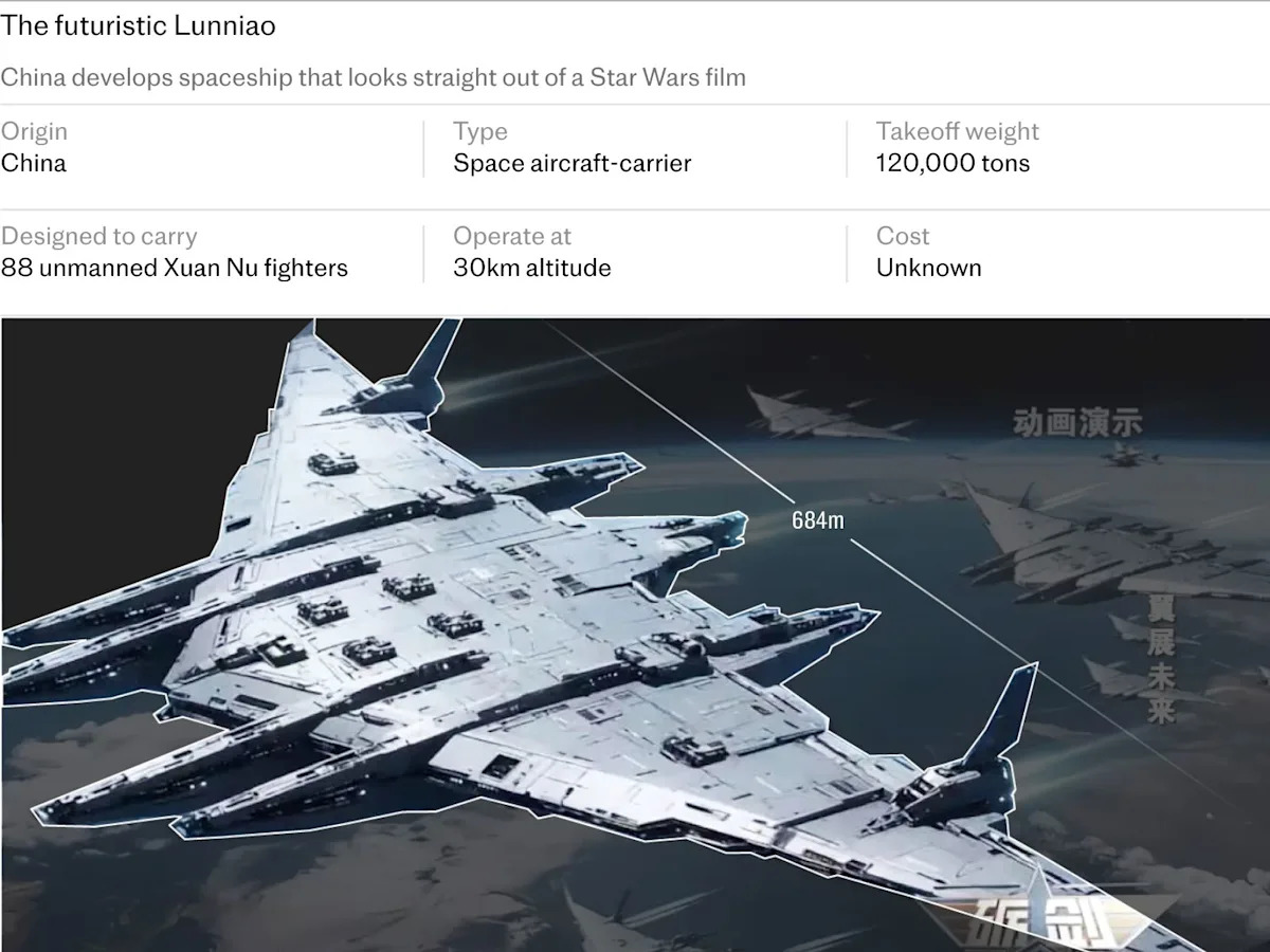 A mídia estatal divulgou um vídeo conceitual do futurista Luanniao, o maior navio de guerra do mundo, viajando pelo espaço acima de todos os sistemas defensivos atuais.