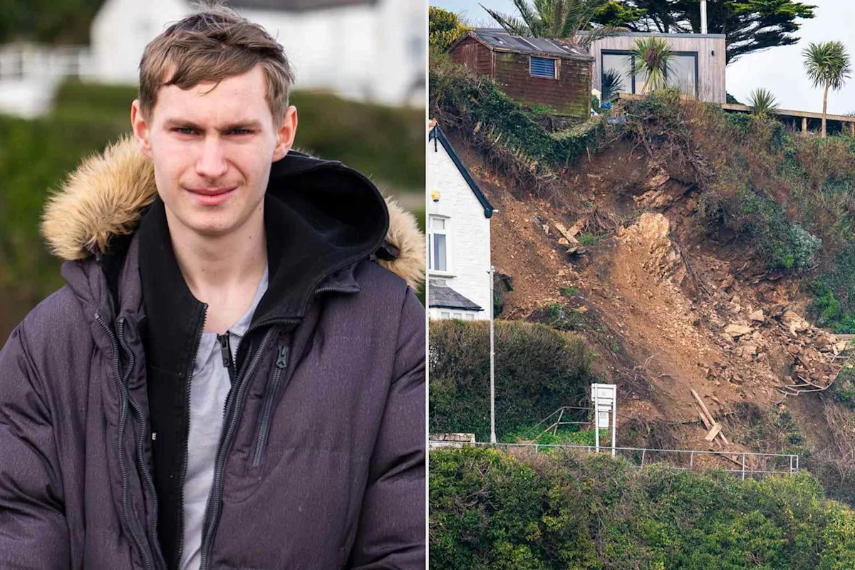 Kieron English, 20 anos, estava caminhando com um amigo quando uma parte de um penhasco em que eles caminhavam na Cornualha desabou repentinamente