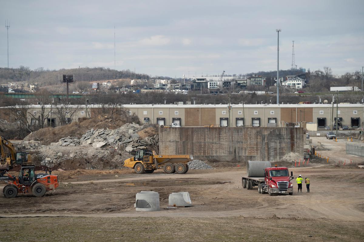 A demolição e outros trabalhos de preparação começaram no terreno de 70 acres – delimitado pelo rio Cumberland a oeste – para o campus da Oracle Nashville em Nashville, Tennessee, segunda-feira, 23 de fevereiro de 2026.