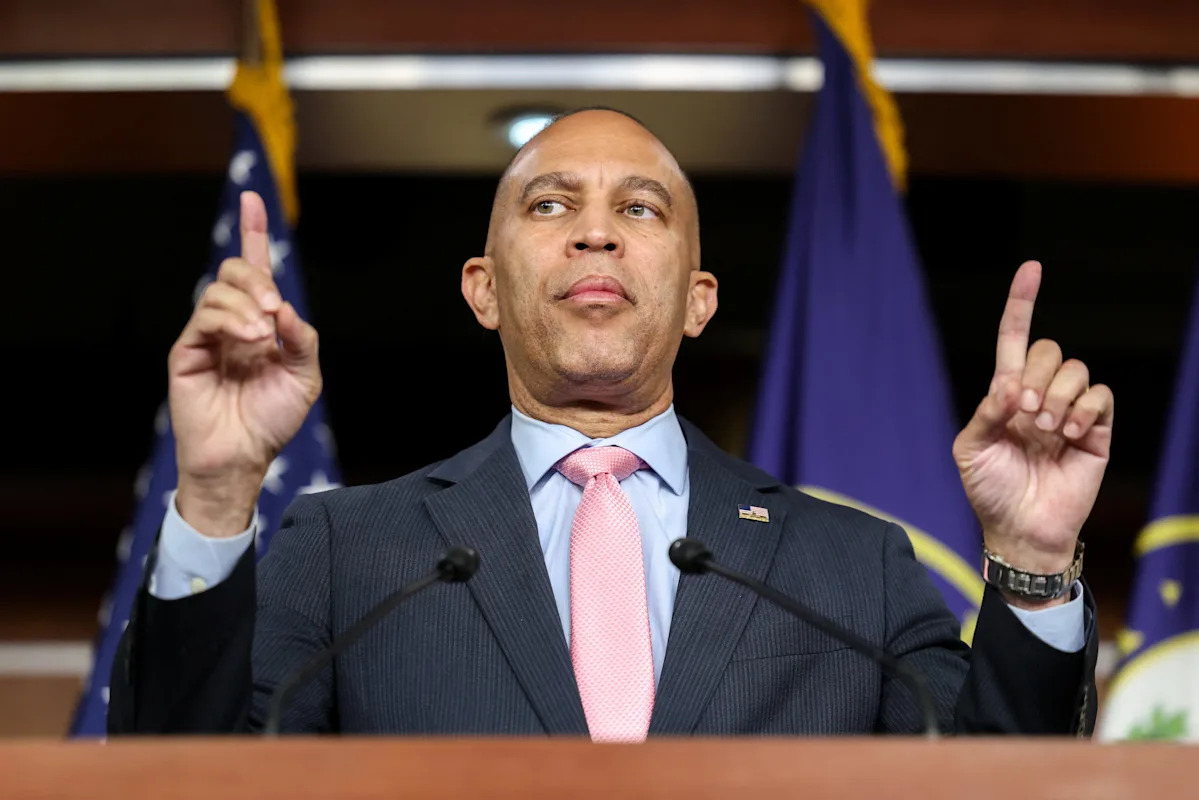 O líder da minoria na Câmara, Hakeem Jeffries, D-Nova York, fala durante uma entrevista coletiva no Capitólio em Washington, DC, em 28 de outubro de 2025, para discutir como a paralisação governamental em curso está afetando os benefícios de ajuda alimentar e cuidados de saúde do SNAP.