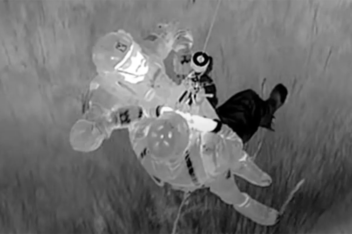 Os socorristas localizaram os dois de helicóptero, e as imagens mostram a dupla agitando os braços no ar para atrair a atenção dos socorristas. O pequeno incêndio também ajudou a unidade de aviação CCSO a localizá-los.
