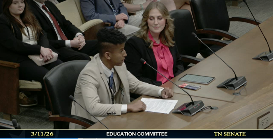 Ben Mason, aluno do ensino médio, à esquerda, testa a favor do Charlie Kirk American Heritage Act durante uma audiência do Comitê de Educação do Senado na quarta-feira, 11 de março de 2026, no prédio do Cordell Hull State Office em Nashville, Tennessee.
