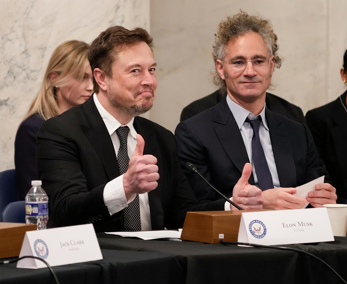 Elon Musk, X e Tesla, CEO, à esquerda, aprovam a pergunta de um repórter, sentados ao lado de Alex Karp, Palantir, em 13 de setembro de 2023 em Washington DC.