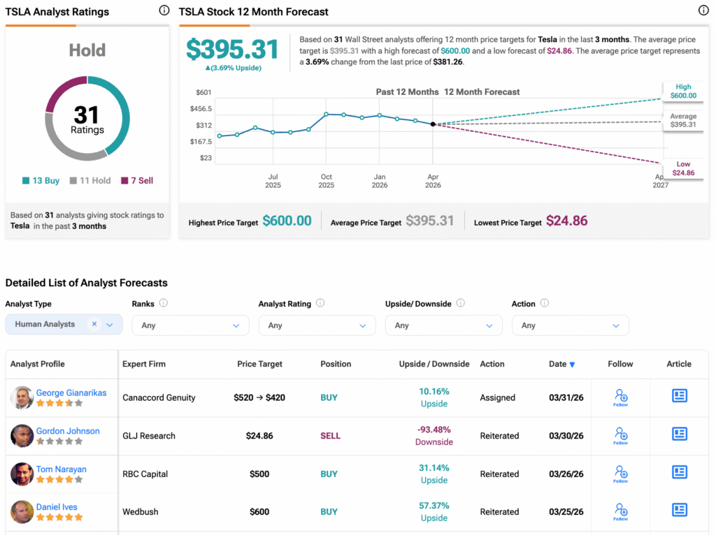 De acordo com TipRanks, as ações da TSLA receberam uma classificação de consenso Hold, com 13 compras, 11 retenções e sete vendas atribuídas nos últimos três meses. O preço-alvo médio das ações da Tesla é de US$ 395,31, sugerindo uma valorização potencial de 3,69% em relação ao nível atual.